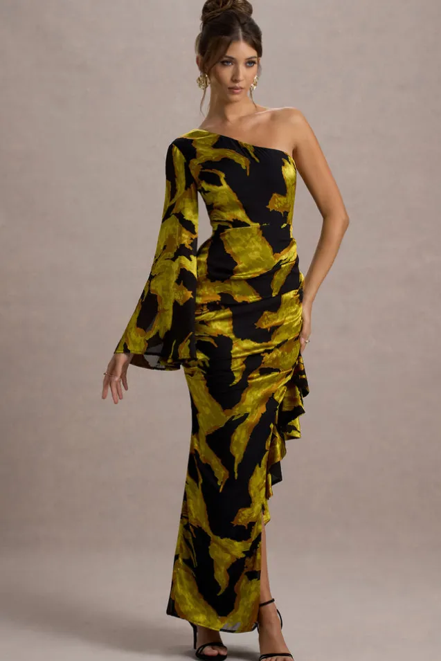 Bold and beautiful are two words that perfectly describe Sevilla. Designed in an abstract print of mustard and black tones, this maxi dress is defined by an asymmetric neckline, long billowy sleeve and ruffled split detail. With so many elevated details to love, let Sevilla do the talking and pair yours with some simple strappy stilettos this event season.Features – Premium satin jacquard- Asymmetric neckline – Single sleeve- Invisible zip closure – Ruffled split- Maxi length Sizing & Fit Model is 5’7 and wears UK size 8/US size 4 Product Information Designed exclusively by Club L London Lined with little stretch Premium satin jacquard in Mustard Print (95% Polyester, 5% Elastane) 155cm total length