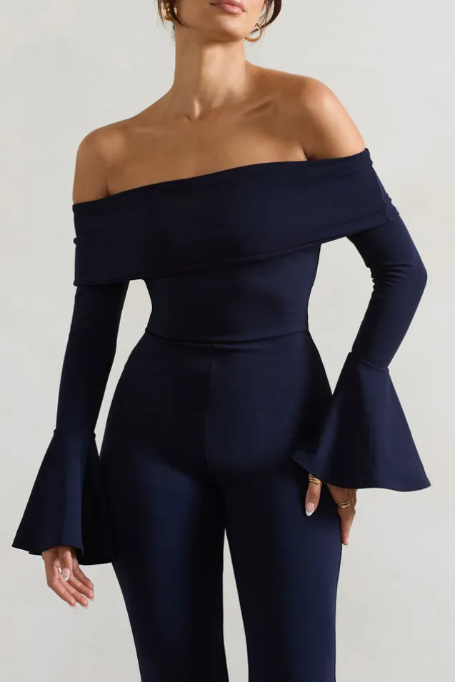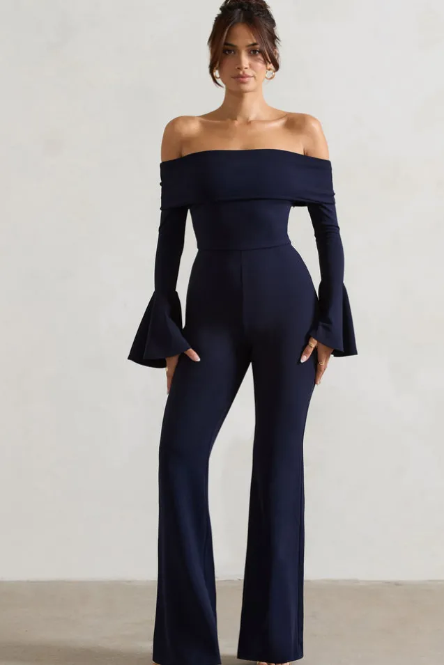 Shauna | Navy Bardot Long-Sleeve Flared Jumpsuit