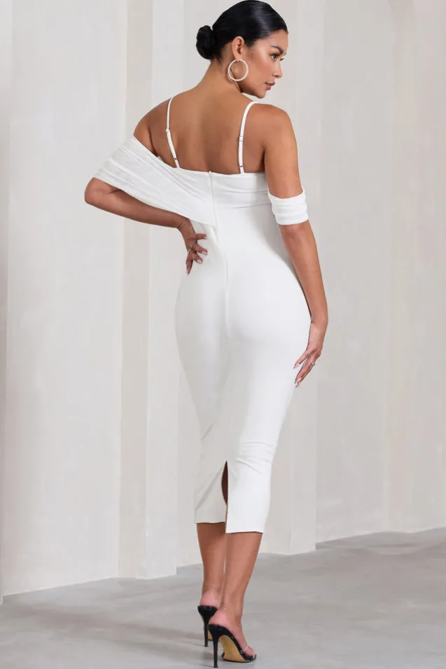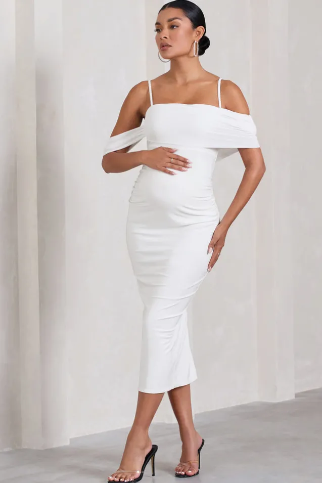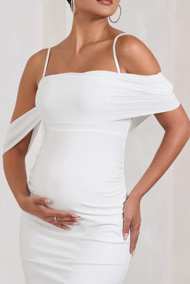 Shelby | White Mesh Bardot Strappy Maternity Midi Dress