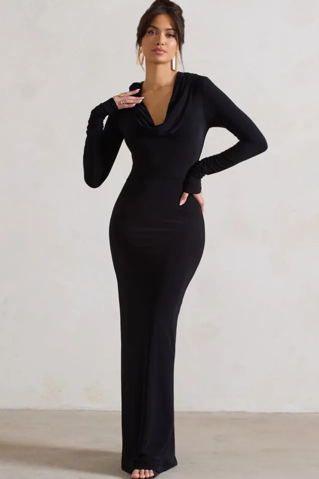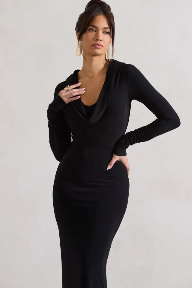 Shira | Black Long-Sleeve Hooded Maxi Dress