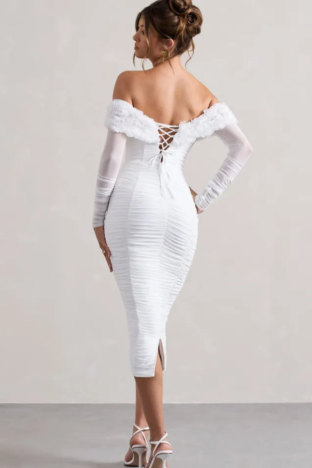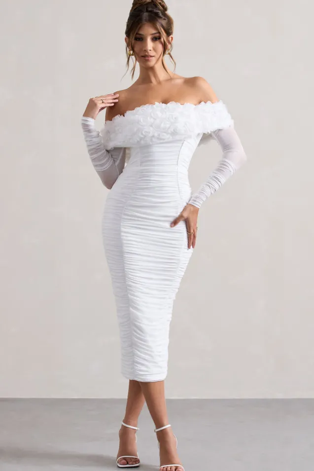 Sierra | White Mesh Ruched Floral Bardot Lace-Up Midi Dress