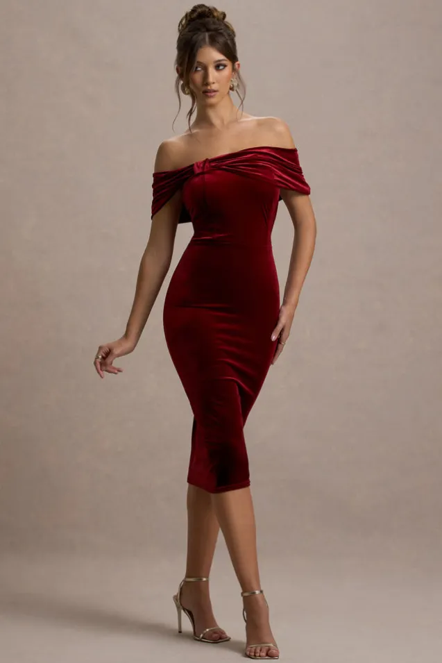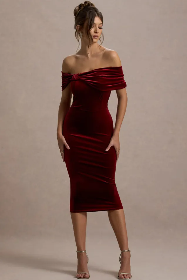 Snowflake | Berry Velvet Bardot Bow Detail Midi Dress