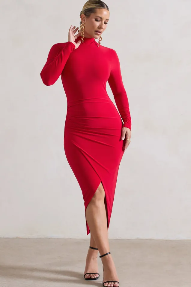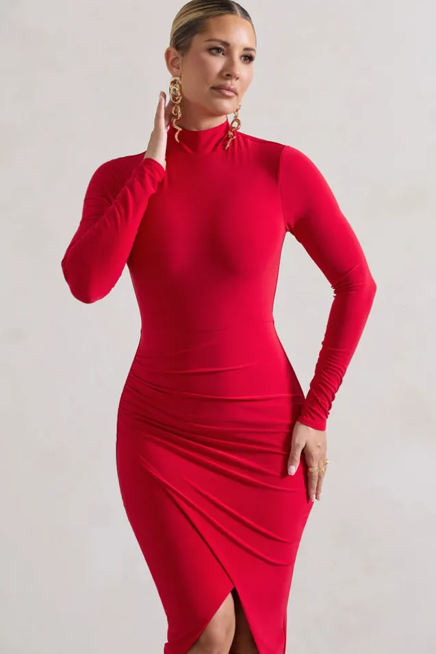 Our Soha dress is fitting for any upcoming occasion on your social calendar. Cut in our premium jersey, this red midi dress is designed to flatter all figures. Soha is defined by a modest high neckline, elegant long sleeves and a curve enhancing gathered wrap skirt. Pair yours with some statement earrings like Eliana and a sleek bun for the perfect occasion look.Features – Premium jersey- Bodycon fit – High neckline – Long sleeves – Invisible zip closure – Wrapped skirt – Midi length Sizing & Fit Model is 5’8 and wears UK size 8/US size 4 Product Information Designed exclusively by Club L London Fully lined with good stretchPremium jersey in Red (95% Polyester, 5% Elastane) 120cm total length