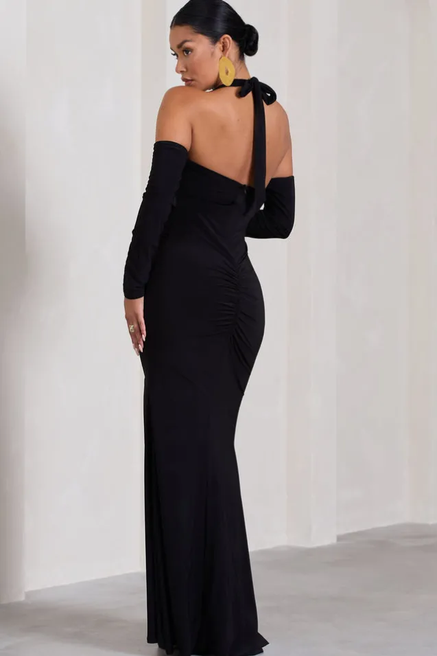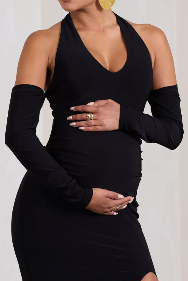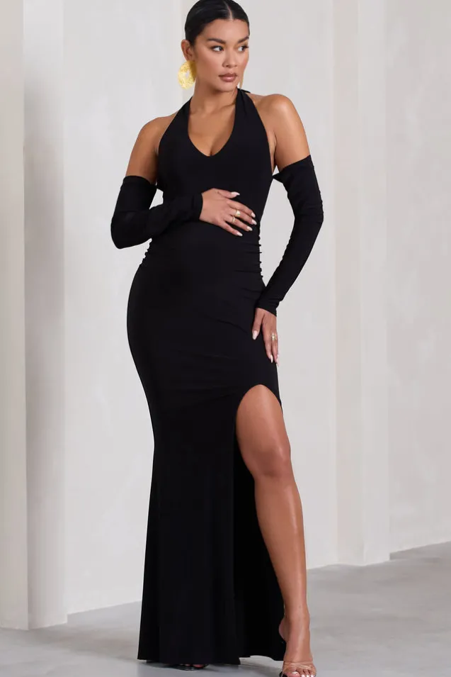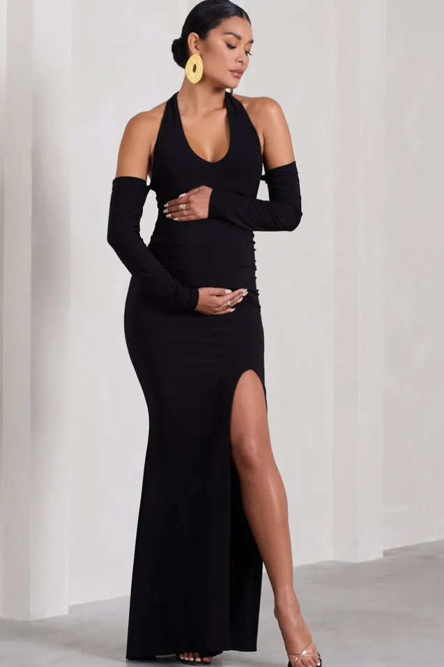 Solana | Black Halter-Neck Long-Sleeve Split Maternity Maxi Dress