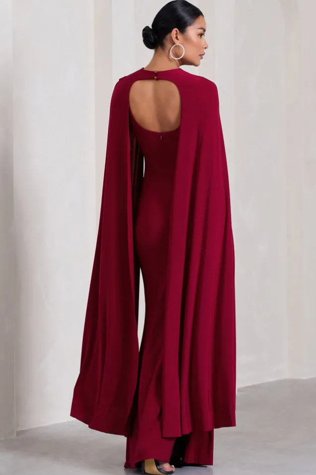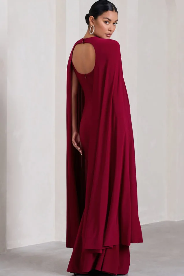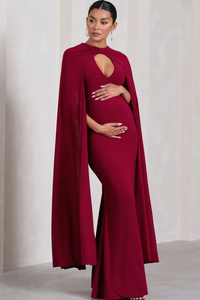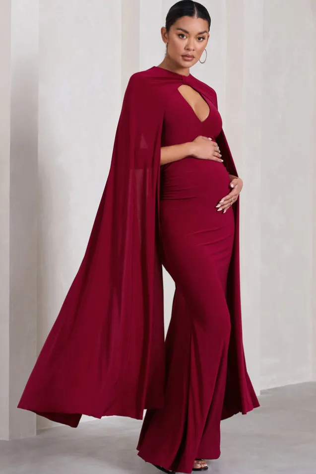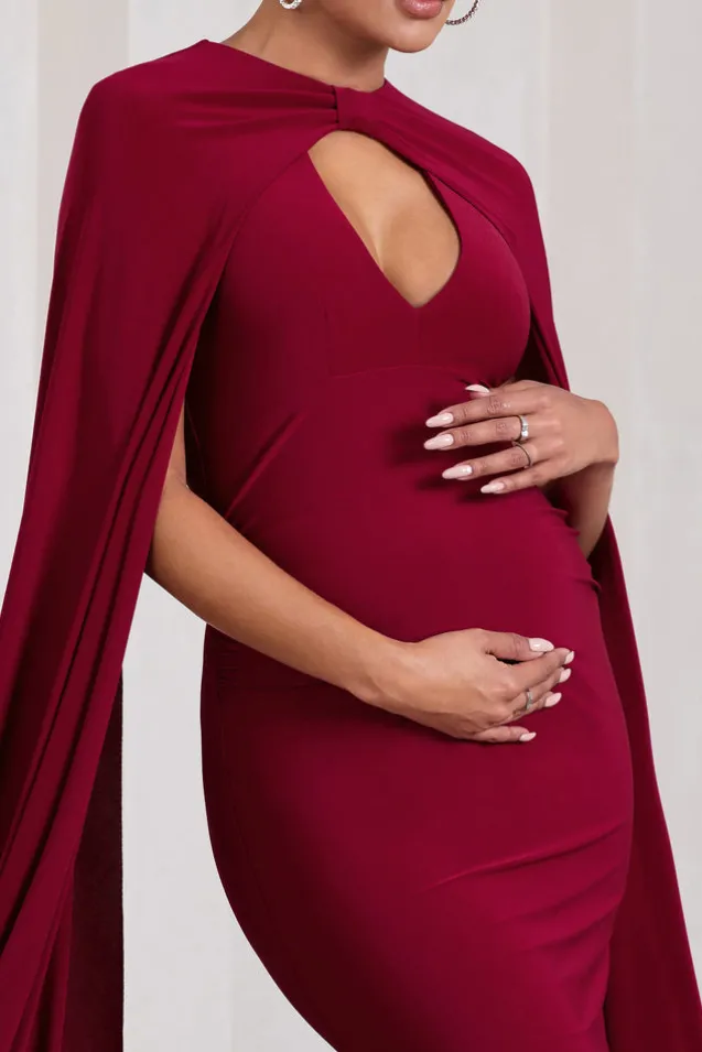 Standing Ovation | Berry Plunge-Neck Cape Maternity Maxi Dress