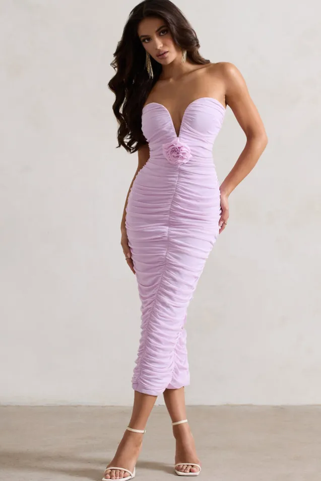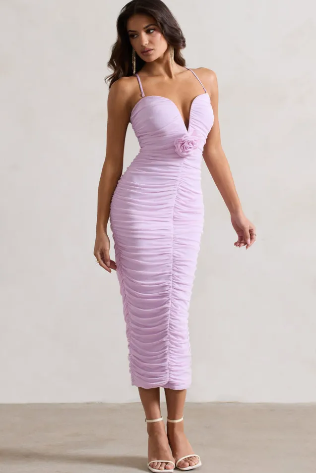 Taken | Pink Ruched Mesh Midi Dress With Corsage