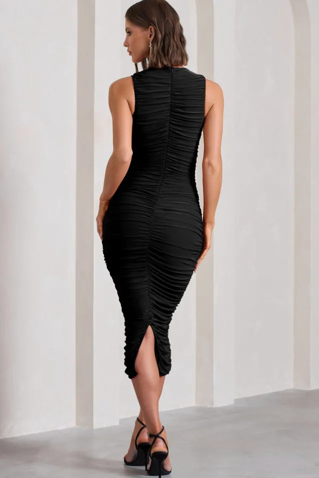 Tempting Fate | Black Ruched Bodycon V-Neck Maxi Dress