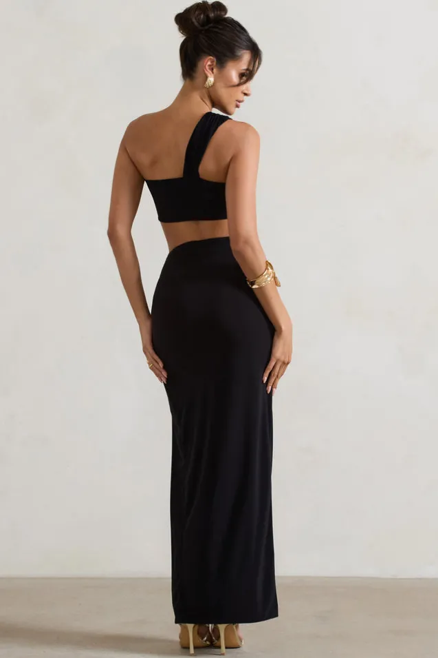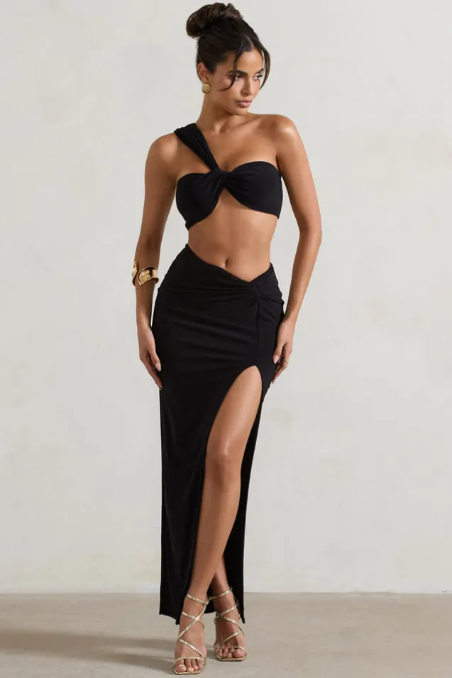 You may be heading somewhere sunny but your silhouette in this split maxi skirt will certainly bring the heat. Affectionately named Tender Kiss, this long black skirt features a twisted knot to the front of a high-rising waistband. Pair Tender Kiss with Open Heart, our bestselling bralette made from the same stretchy black jersey.Features- Premium stretch jersey- High rise- Twisted knot detail- Split hemline- Maxi length- Matches Open Heart braletteSizing & FitModel is 5’6″ and wears UK size 8/US size 4Product InformationDesigned exclusively by Club L LondonFully lined with good stretchPremium jersey in Black (95% Polyester, 5% Elastane)104.5cm total length
