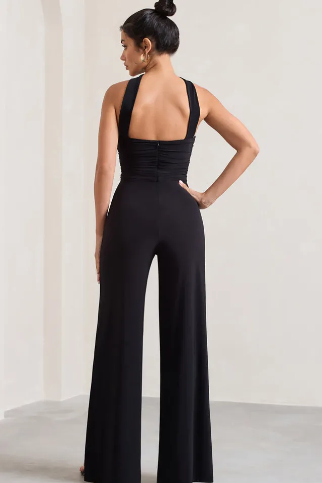 Carefully crafted in our signature stretch jersey, The Next Naomi features a flattering ruched bodice to accentuate your feminine curves. Perfect for any upcoming formal event, this black jumpsuit is finished with a split wide-leg detail to add a sultry flair to the piece. Try styling a sleek ponytail with The Next Naomi to show off its elegant halter collar.Features- Premium stretch jersey- Halter collar – Bandeau neckline- Ruched bodice – Invisible zip closure – Wide-leg – Split legsSizing & fitModel is 5’8″ and wears UK size 8/US size 4Product informationDesigned exclusively by Club L LondonDouble layered with some stretchPremium jersey in Black (95% Polyester, 5% Elastane)84cm inside leg length