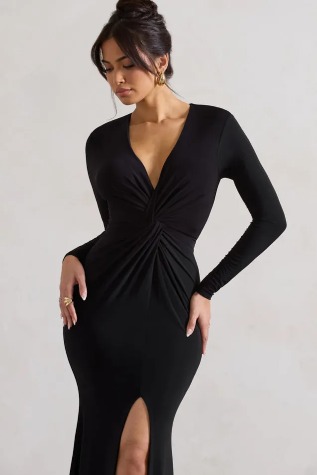 Tianna | Black Plunge-Neck Twisted Split Maxi Dress