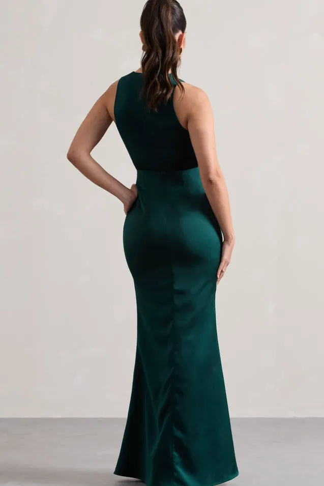 Tiffany | Bottle Green Satin Plunge-Neck Maxi Dress