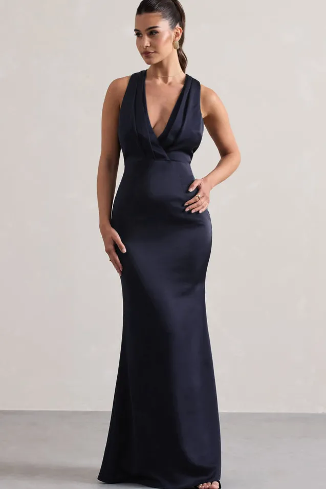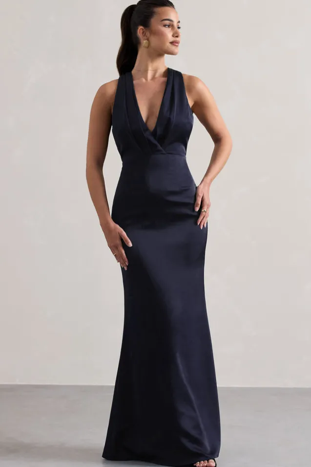 Tiffany | Navy Satin Plunge-Neck Maxi Dress
