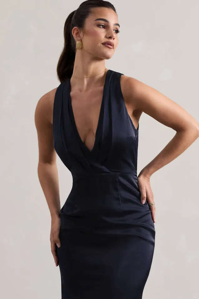 Here to see you through every occasion is Tiffany, our latest satin maxi dress. Arriving in a classic navy shade of our premium satin, this timeless piece boasts a feminine plunge neckline and flattering fitted skirt. Style Tiffany with an elegant tousled bun and some silver accents for the perfect black tie look.Features – Premium satin- Bodycon fit – Plunge neckline – Sleeveless- Button closed keyhole- Invisible zip closure- Maxi length Sizing & Fit Model is 5’7 and wears UK size 8/US size 4Product Information Designed exclusively by Club L London Partially lined with no stretch Premium satin in Navy (100% Polyester)155cm total length