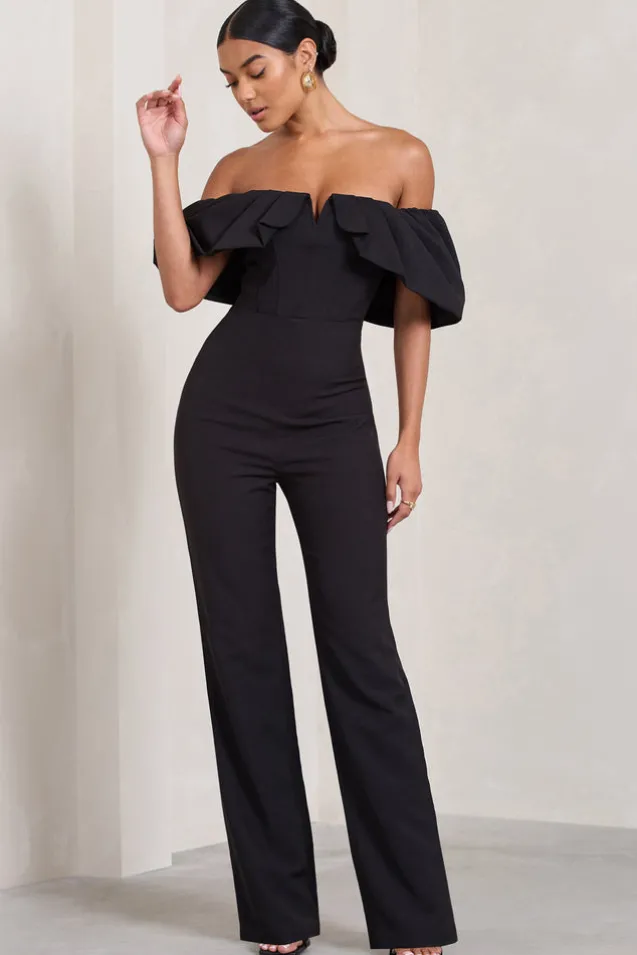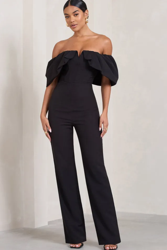 Time Will Tell is the form-fitting jumpsuit to stand out in any lavish evening setting. Crafted in a premium black crepe with supportive stretch and structured boning, this Bardot jumpsuit boasts voluminous short sleeves that drape off each shoulder and long wide legs. Style this special occasion staple with diamond drop earrings for timeless appeal.Features- Premium stretch crepe- Bardot neckline- Voluminous sleeves- Boned bodice- Invisible zip closure- Wide legsSizing & FitModel is 5’8″ and wears UK size 8/US size 4Product DescriptionsDesigned exclusively by Club L LondonFully lined with good stretchPremium crepe in Black (90% Polyester, 10% Elastane)85cm inside leg length