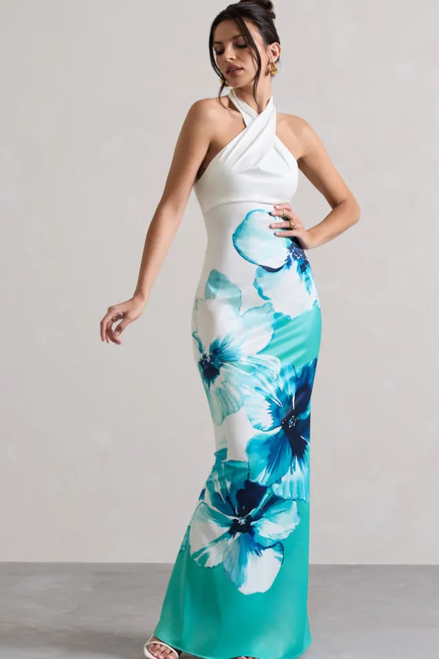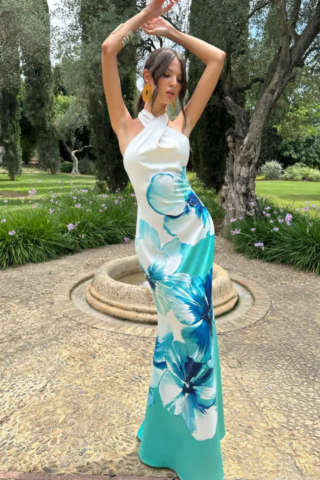 Tropicana | Blue Floral Satin Cross Over Halterneck Maxi Dress