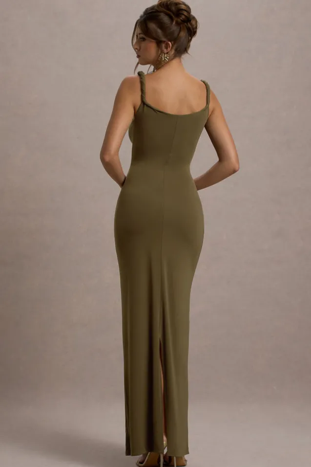 Twist Of Fate | Khaki Green Twist-Neck Maxi Dress