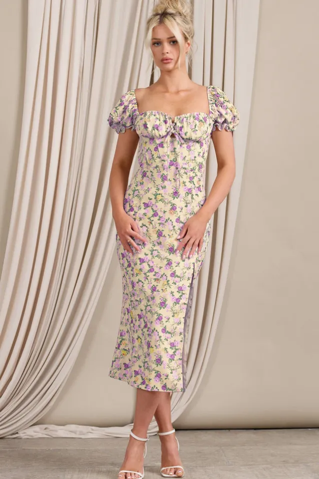 Two Scoops | Yellow Floral Puff-Sleeved Corset Split Midi Dress