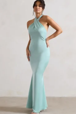 Unbeatable | Mint Green Satin Cross Over Halter-Neck Maxi Dress