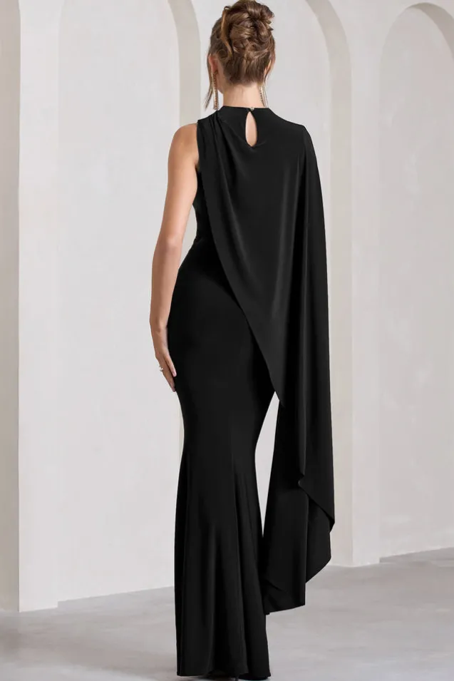 Unveil | Black One-Sleeve Cape Maxi Dress