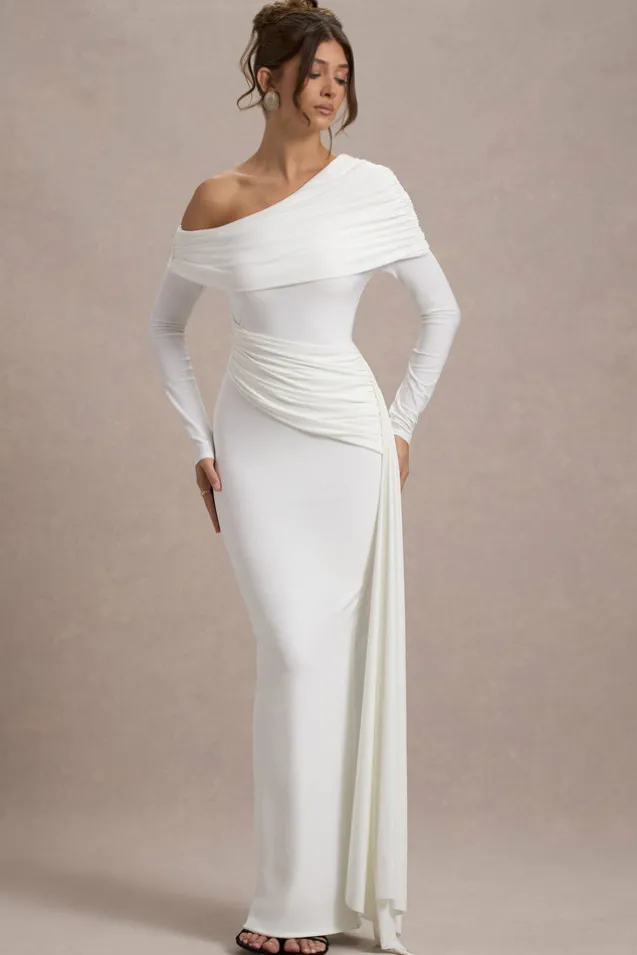 Event season calls for a timeless piece like Valina. Carefully crafted in a deep white shade of our signature stretch jersey, this floor-sweeper features partial ruching throughout to flatter your silhouette. Complete with a lavish side drape, let Valina do the talking and team yours with some simple strappy stilettos and gold hoops.Features – Premium stretch jersey- Partially ruched- Asymmetric neckline- Invisible zip closure- Long sleeves- Side drape- Maxi length Sizing & Fit Model is 5’7 and wears UK size 8/US size 4 Product Information Designed exclusively by Club L London Double layered with good stretch Premium jersey in White (95% Polyester, 5% Elastane) 155cm total length