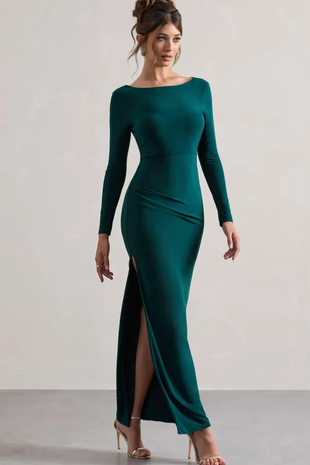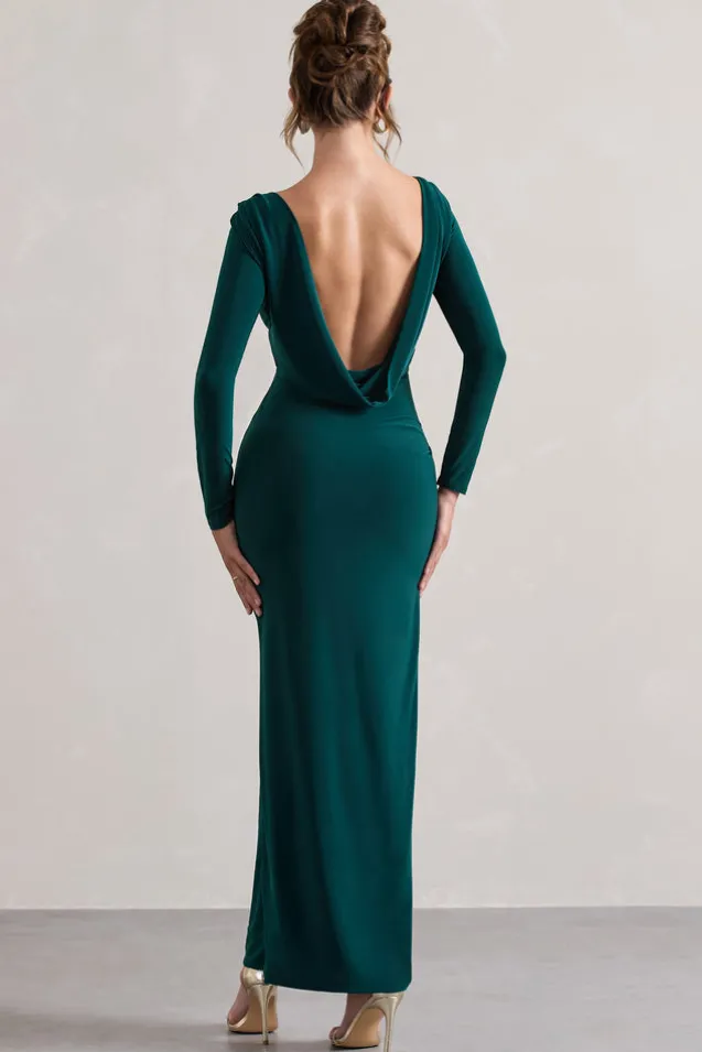 Virgo | Bottle Green Cowl-Back Long-Sleeve Split Maxi Dress