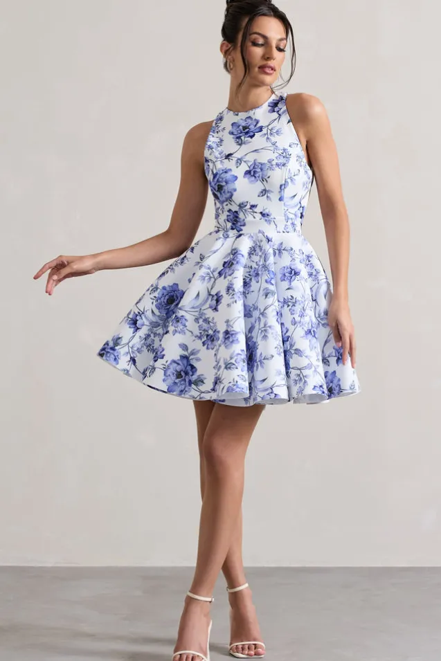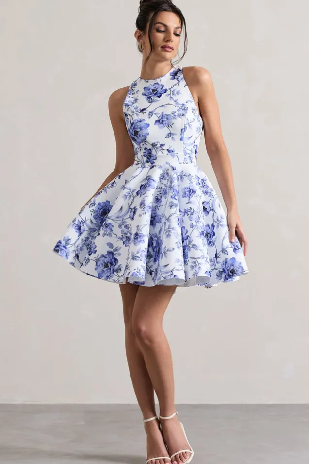Waverly | Blue Floral Racer-Neck Sleeveless Skater Mini Dress