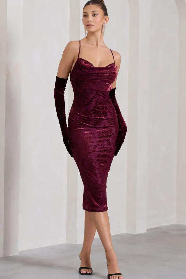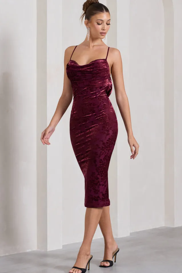 Exude a romantic state of mind in our latest midi Whitney. Crafted in a premium stretch devore fabric, this figure-hugging piece boasts a draped cowl neckline highlighted by supportive padded wire cups. Adding allure to this berry midi dress is its open cowl-back, highlighted by delicately crossed cami straps. Perfect for dinners, nights out and everything in between, elevate Whitney with some strappy stilettos and statement earrings. Features – Premium stretch devore- Bodycon fit – Draped cowl neckline – Wired padded cups- Adjustable cami straps- Invisible zip closure – Strappy cowl open back- Split hemline – Midi length Sizing & Fit Model is 5’7 and wears UK size 8/US size 4 Product Information Designed exclusively by Club L London Fully lined with some stretch Premium devore in Berry (59% Polyester, 30% Polyamide, 11% Elastane) 120cm total length