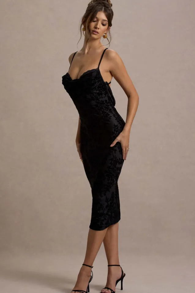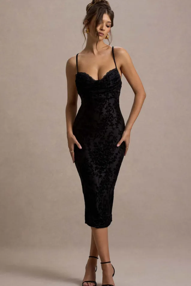 Exude a romantic state of mind in our latest midi Whitney. Crafted in a premium stretch devore fabric, this figure-hugging piece boasts a draped cowl neckline highlighted by supportive padded wire cups. Adding allure to this black midi dress is its open cowl-back, highlighted by delicately crossed cami straps. Perfect for dinners, nights out and everything in between, elevate Whitney with some strappy stilettos and statement earrings. Features – Premium stretch devore- Bodycon fit – Draped cowl neckline – Wired padded cups – Adjustable cami straps- Invisible zip closure – Strappy cowl open back- Split hemline – Midi length Sizing & Fit Model is 5’6 and wears UK size 8/US size 4 Product Information Designed exclusively by Club L London Fully lined with some stretch Premium devore in Black (59% Polyester, 30% Polyamide, 11% Elastane) 120cm total length