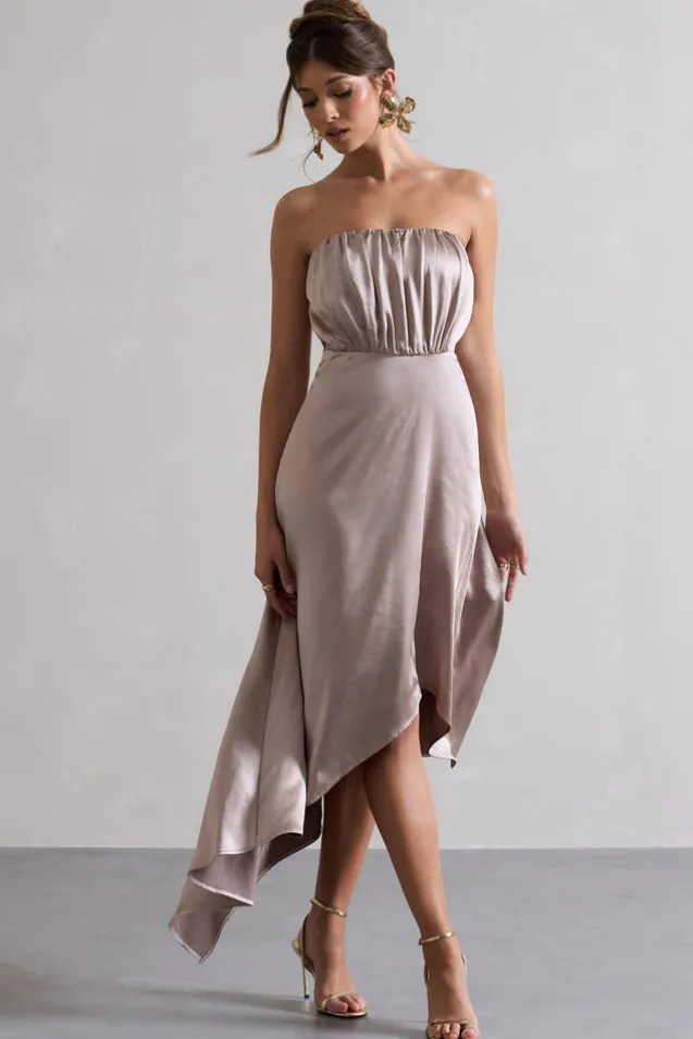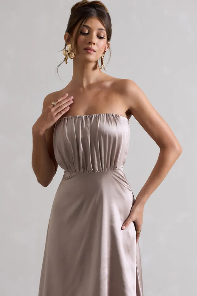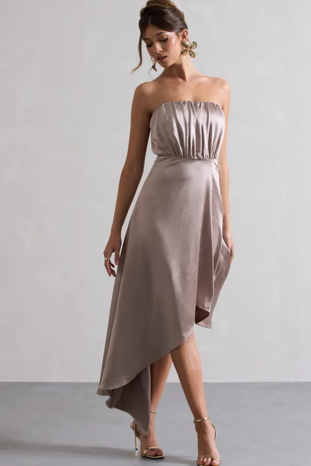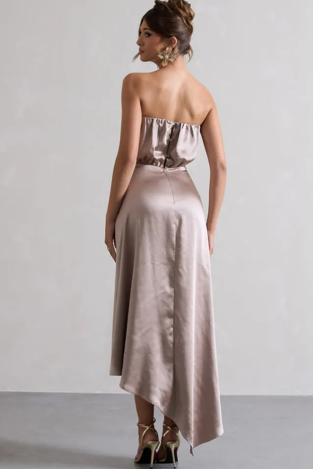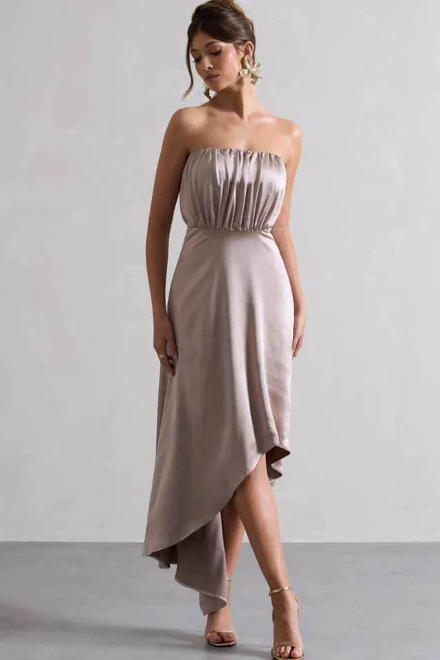 Willa | Taupe Satin Bandeau Maxi Dress With Asymmetric Hem