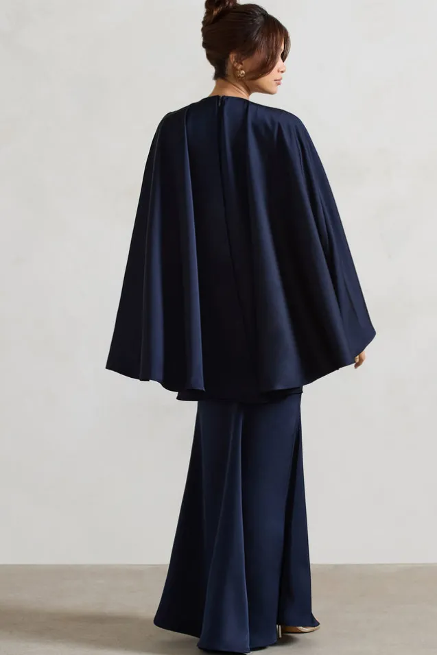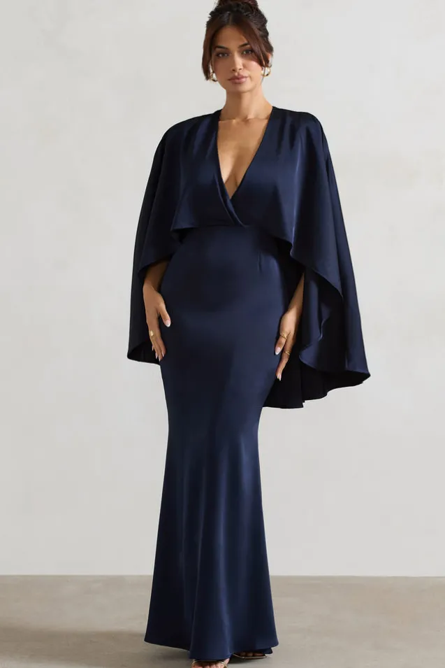 Yasie | Navy Satin Plunge-Neck Maxi Dress With Cape Sleeves