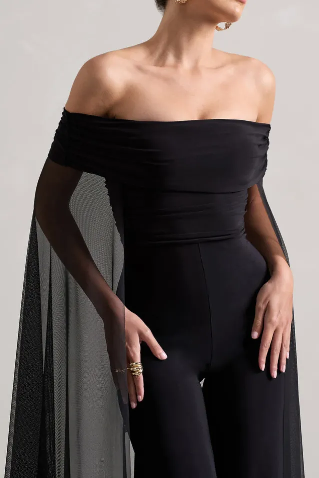 Zita | Black Bardot Jumpsuit With Chiffon Cape