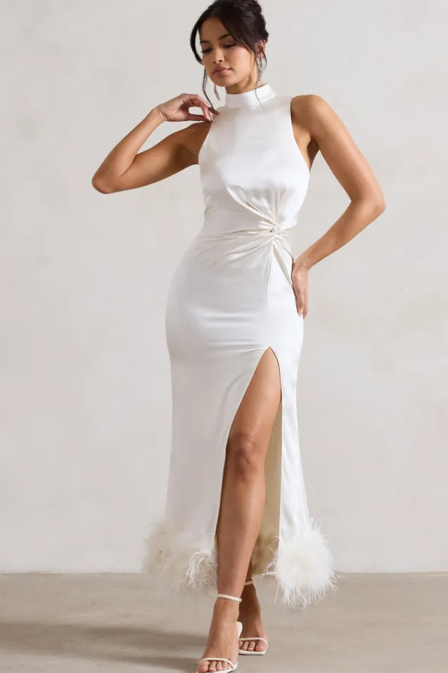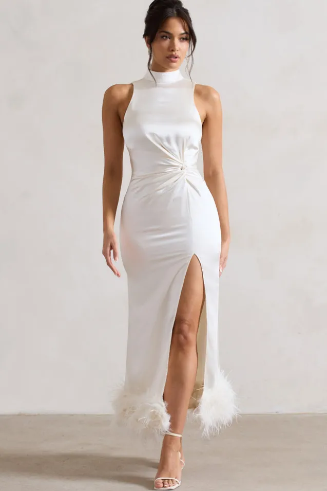 Zoe | Cream Satin Twist Split Maxi Dress With Feather Trim