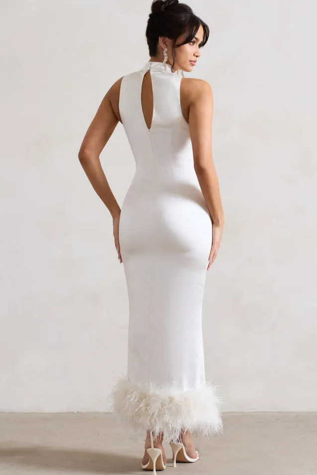 The perfect addition to your occasion wardrobe is Zoe, a classic yet statement maxi dress. Crafted in a premium cream satin, Zoe features an elegant high neckline and keyhole detailing at the back. This elegant style has a flattering twist detail at the front that leads into a romantic thigh split. Finished off with a fluffy feather trim to add extra glamour, try pairing this maxi with a sleek bun to complement its stunning neckline.Features – Premium satin- High neckline – Sleeveless – Button closed keyhole- Invisible zip closure – Front high split- Feather hem- Maxi length Sizing & Fit Model is 5’8 and wears UK size 8/US size 4 Product Information Designed exclusively by Club L London Unlined with no stretch Premium satin in Cream (100% Polyester) 140cm total lengthProduct CareTo prolong the life of your feathers, please dry clean this product only.Please hang this style for 24 hours for its feathers to fluff and remain in perfect condition.