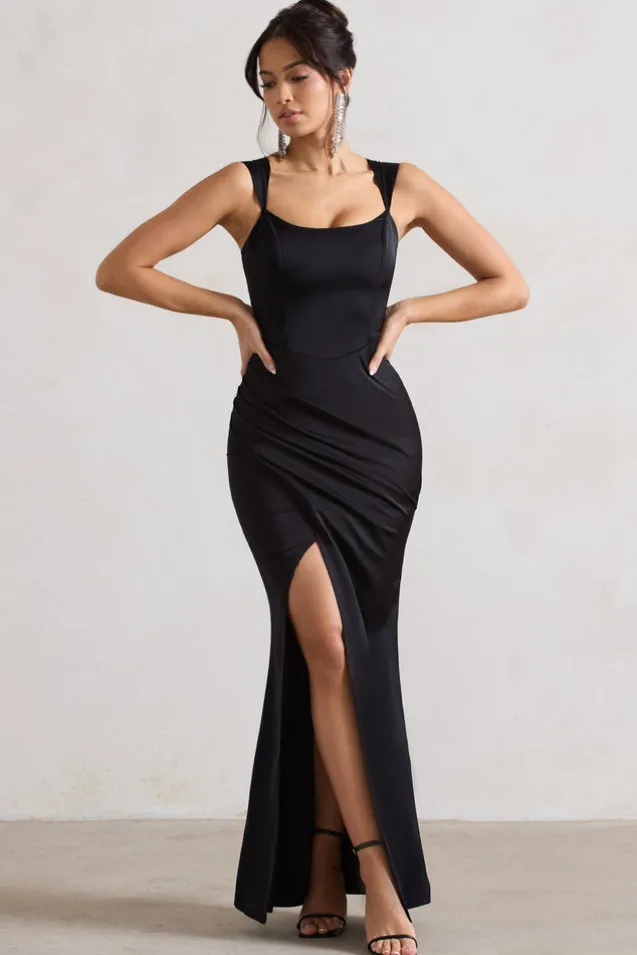 A Romantic | Black Satin Corset Wrap Maxi Dress