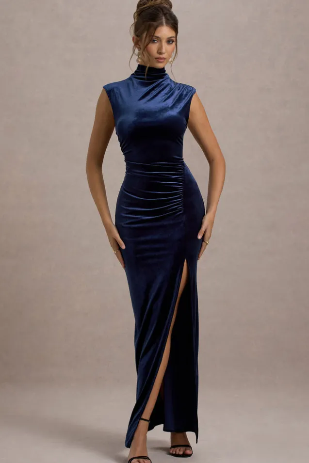 Abilene | Navy Velvet High-Neck Split Maxi Dress