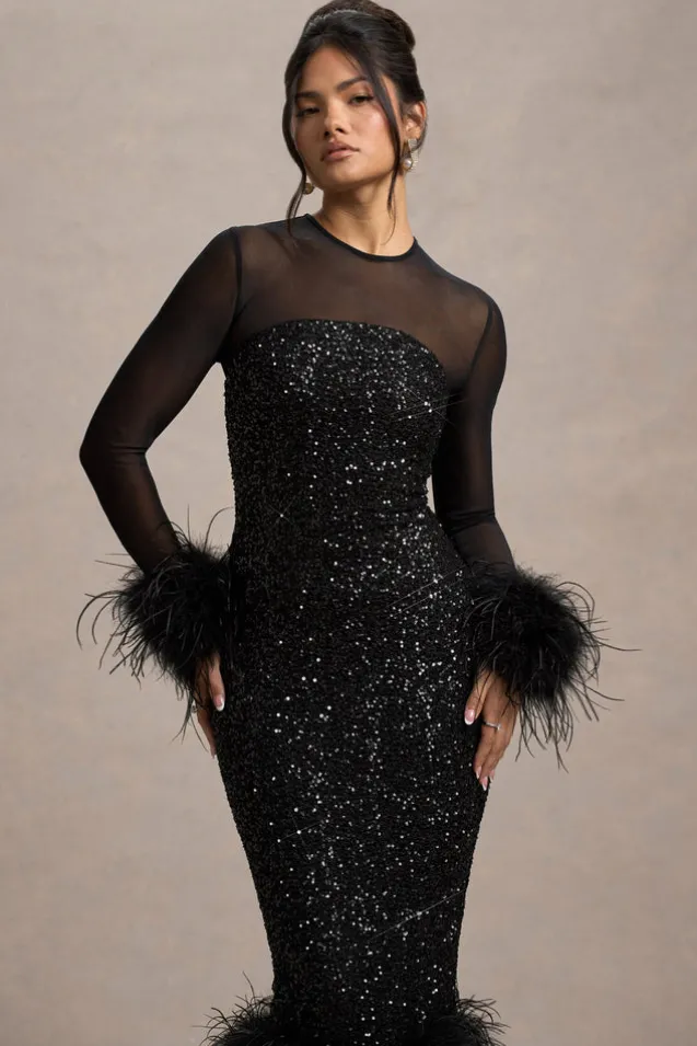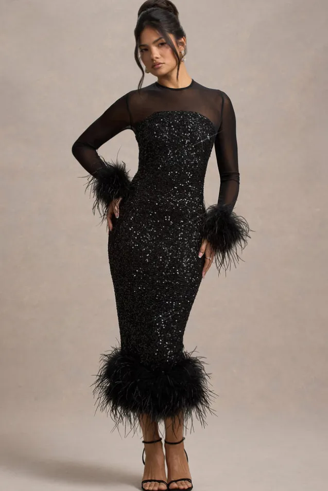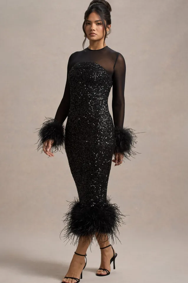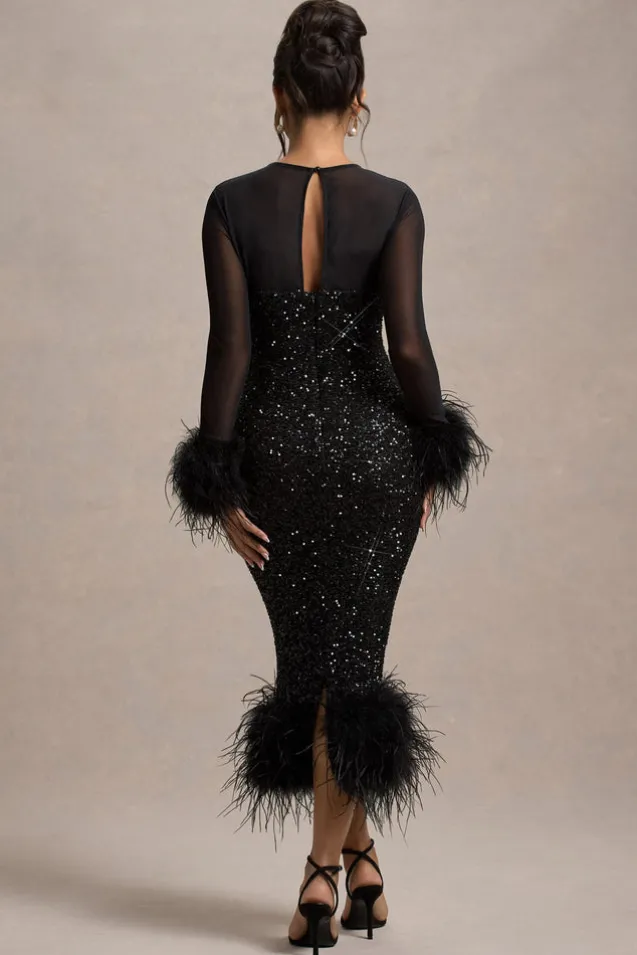 Afterglow | Black Sequin Long-Sleeve Midi Dress With Feather Trims