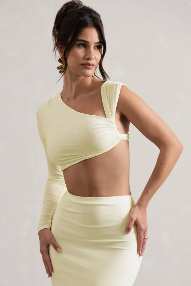 Designed to be artfully asymmetric is our white crop top Agalia. Arriving in our ultra flattering stretch jersey, Agalia is defined by a modern asymmetric neckline and single arm long sleeve. Style this ruched crop top with our Neomie maxi skirt to complete your look.Features – Premium stretch jersey- Asymmetric neckline- Partial ruching – Single arm long-sleeve- Invisible zip closure – Cropped fitSizing & Fit Model is 5’7 and wears UK size 8/US size 4Product Information Designed exclusively by Club L London Double layered with good stretch Premium jersey in White (95% Polyester, 5% Elastane)