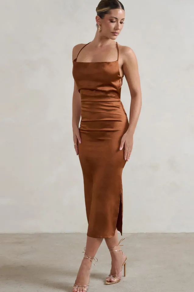 Timeless in both silhouette and shade, our Aja midi dress will surely be styled for many special occasions to come. This sophisticated slip dress is made from premium weighted satin in a warm coppery hue that’s always on trend. A draped cowl neckline and laced open back add understated elegance whilst a high side split brings a little drama.Features- Premium heavy satin- Cowl neckline – Cami straps- Open cowl back- Lace tie closure- Invisible zip closure- Side split skirt- Midi lengthSizingModel is 5’6″ and wears UK size 8/US size 4Product InformationDesigned exclusively by Club L LondonUnlined with no stretchPremium heavy satin in Copper (100% Polyester)120cm length