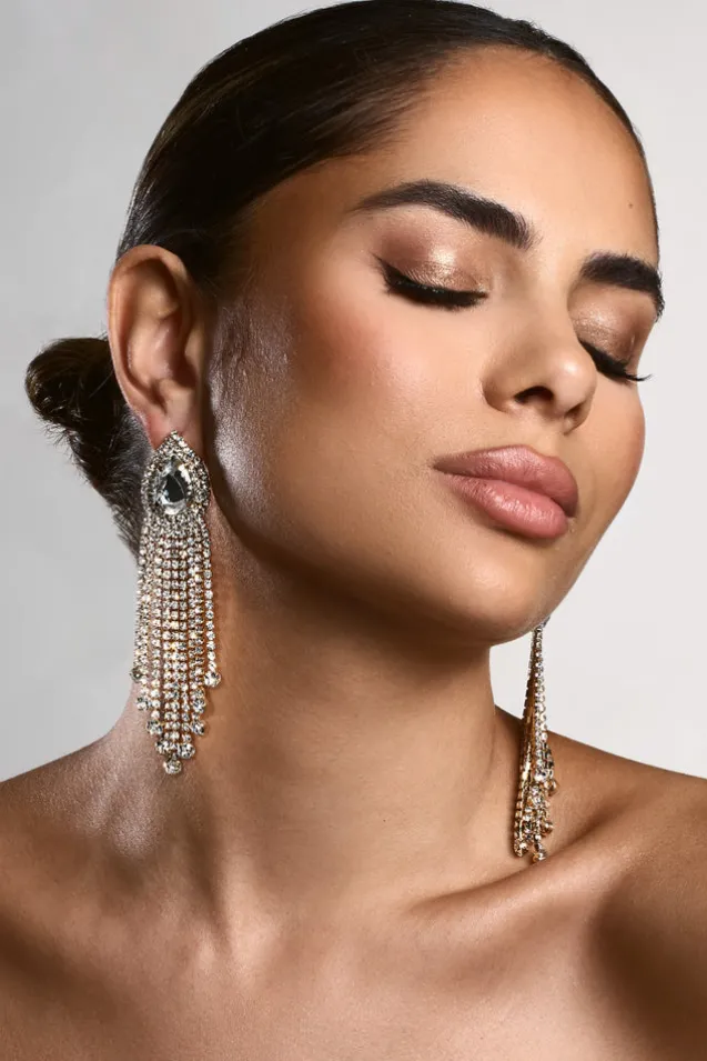 A dazzling set of gold-toned drop earrings with fine diamantes that embellish hanging tassels and shape large pear-cut studs.Features- Drop style- Fine tassels- Multi-sized crystal embellishmentsProduct InformationDesigned exclusively by Club L LondonGold-toned brass (60% Brass, 40% Glass)Stud fastening