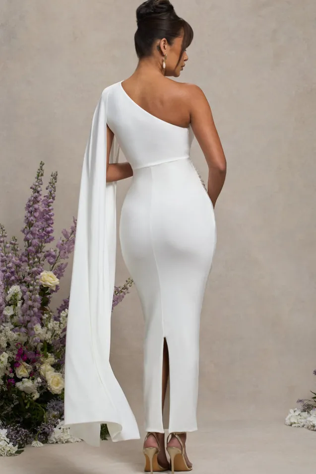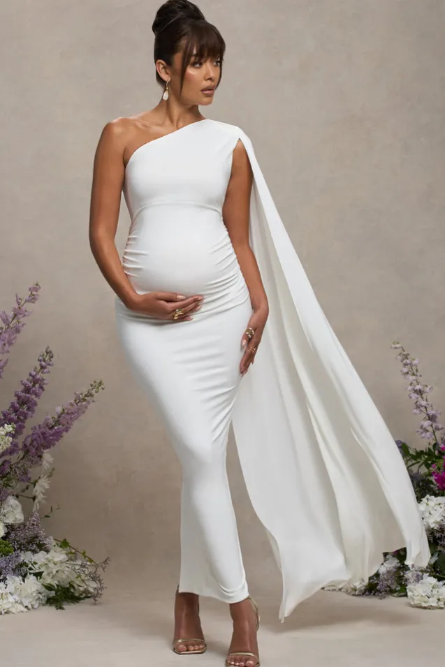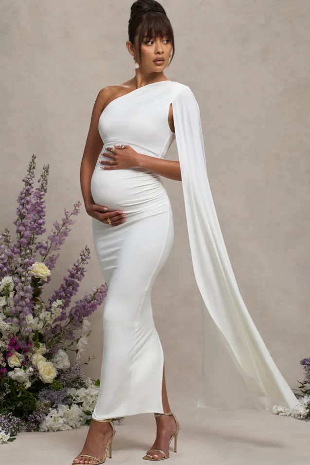 Amaryllis | White Maternity One Shoulder Maxi Dress with Cape Sleeve