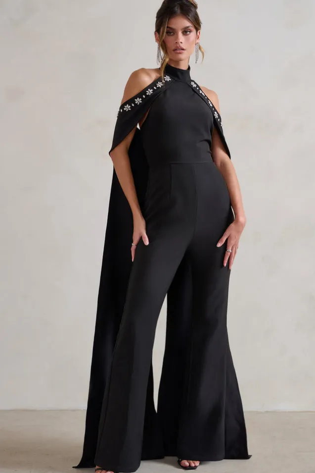 Angel | Black High Neck Jumpsuit with Cold Shoulder Cape Sleeves
