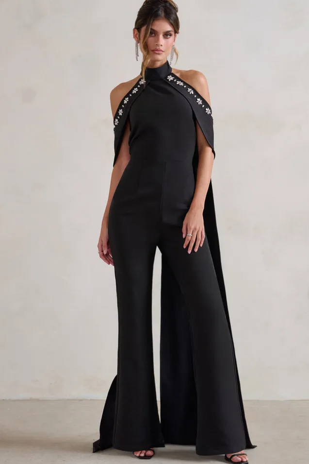 This cape-like creation is perfect for that special occasion with its classic black stretch crepe and embellished trim. A fine option for any special occasion, our Angel jumpsuit boasts high neckline with exposed shoulders and a cascading cape design.Features- Premium stretch crepe- High neckline- Cape design- Embellished trim- Waist darts- Invisible zip closure- Wide legsSizing & FitModel is 5’9″ and wears UK size 8/US size 4Product InformationDesigned exclusively by Club L LondonLined with some stretchPremium crepe fabric in Black (92% Polyester, 8% Elastane)84cm inside leg length