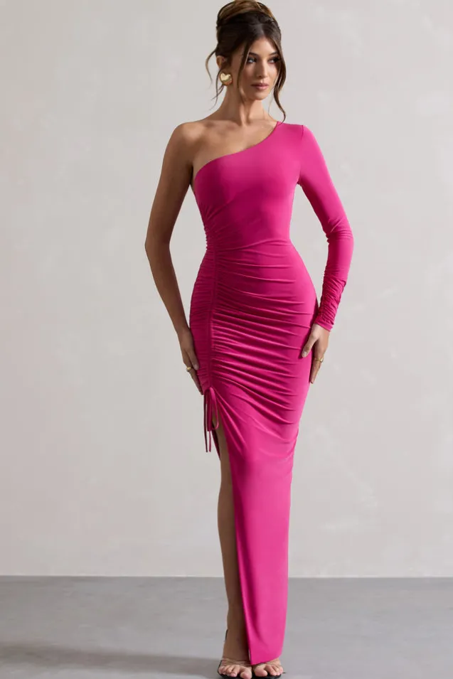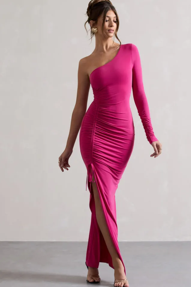 Anima | Dark Pink Asymmetric Ruched One-Sleeve Maxi Dress