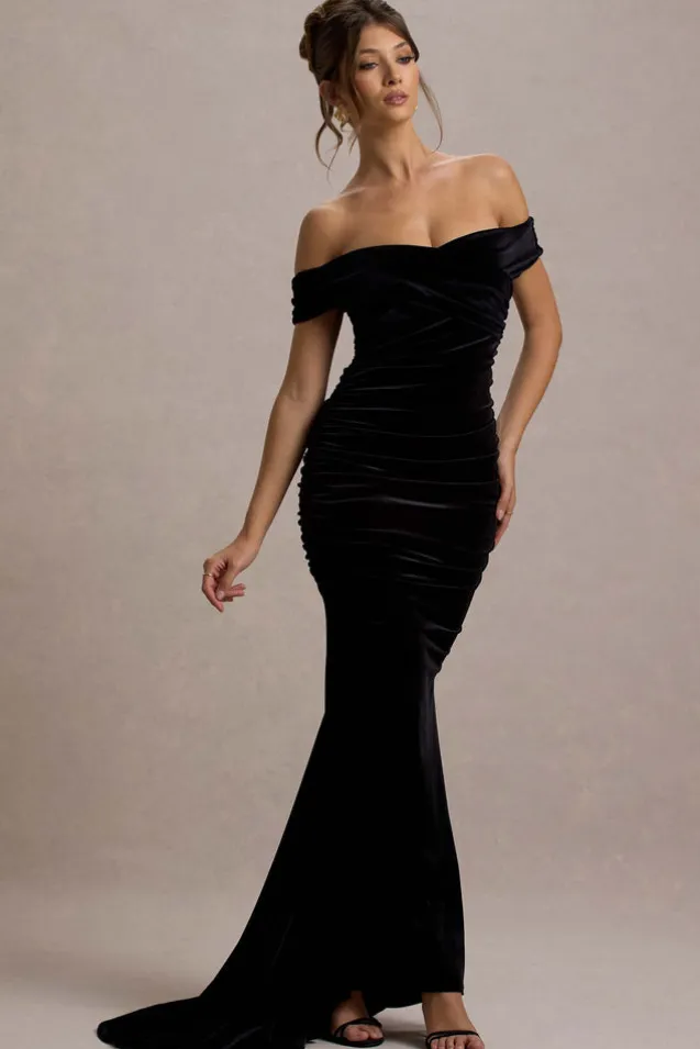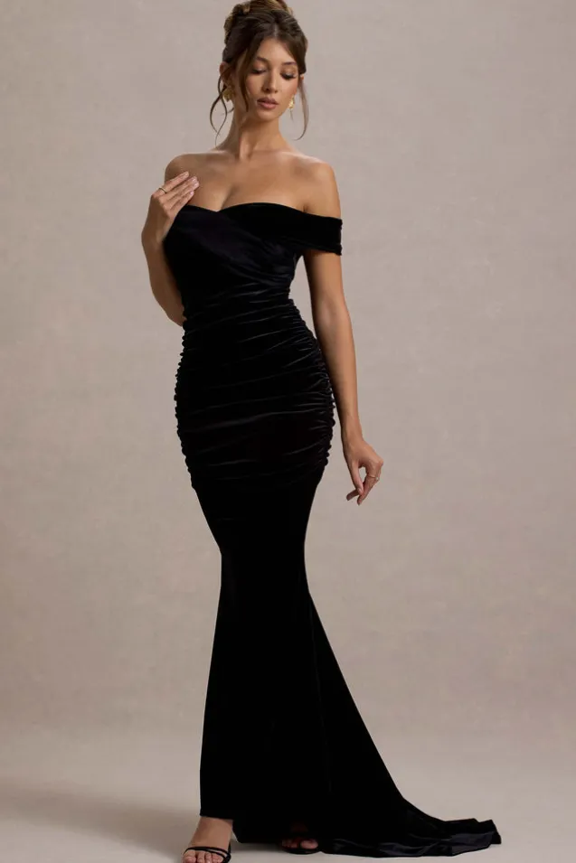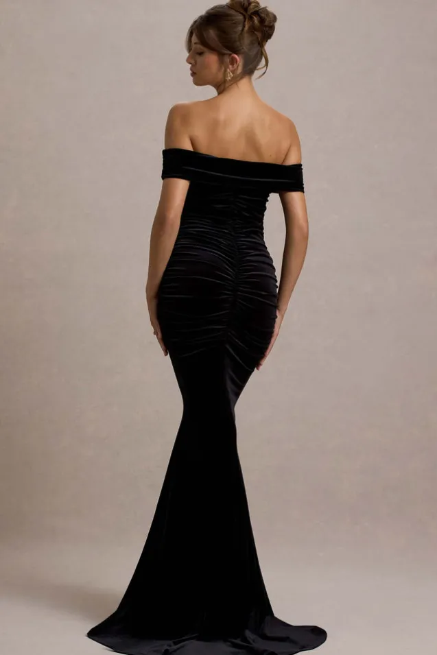 Apolline | Black Velvet Off The Shoulder Ruched Fishtail Maxi Dress