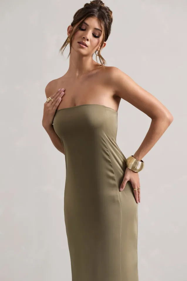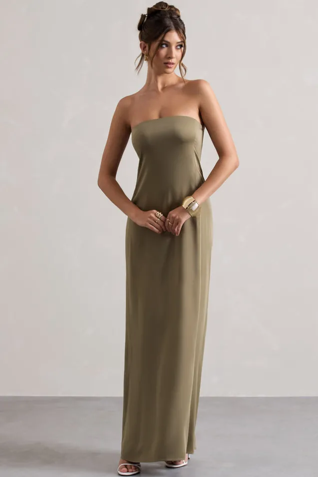 Showcasing a silhouette of pure timeless elegance is Azra. This maxi dress arrives in a rich olive shade of a premium flowing satin and boasts a simple strapless neckline, with an internal boned corset for added structure. Style this minimalistic maxi with some simple gold accents to complete your look.Features – Premium satin- Bandeau neckline – Strapless- Internal boned bodice- Invisible zip closure- Maxi length Sizing & Fit Model is 5’7 and wears UK size 8/US size 4Product Information Designed exclusively by Club L London Unlined with no stretch Premium satin in Olive (96% Polyester, 4% Elastane) 155cm total length