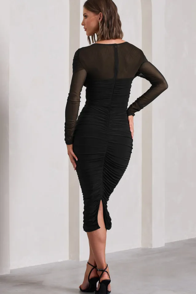 Between The Lines | Black Ruched Mesh Long-Sleeved Bodycon Midi Dress