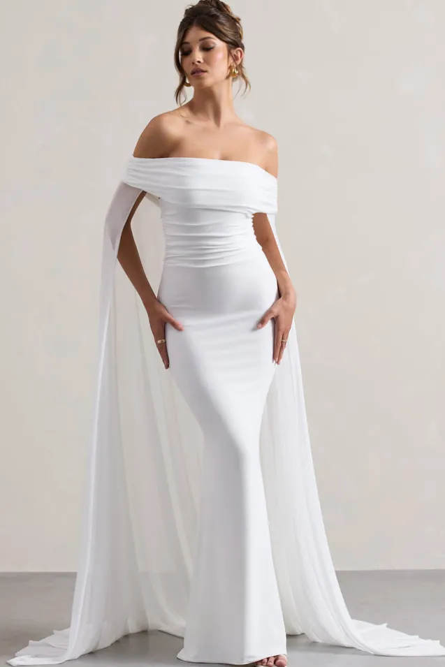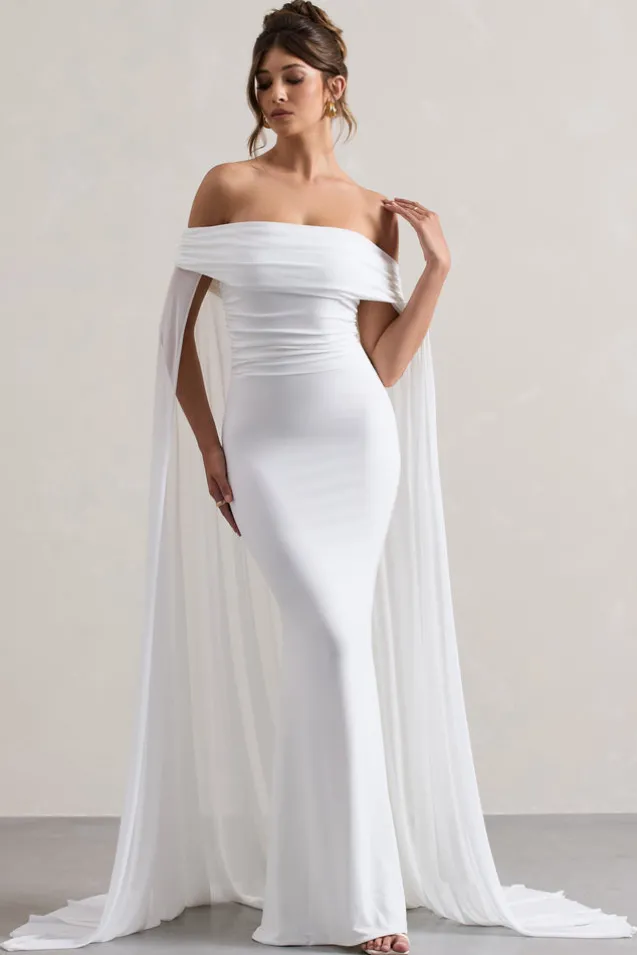 Carlotta | White Bardot Maxi Dress With Chiffon Cape