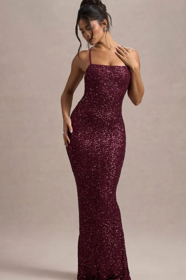 Cosmic | Berry Sequin Square-Neck Strappy Maxi Dress