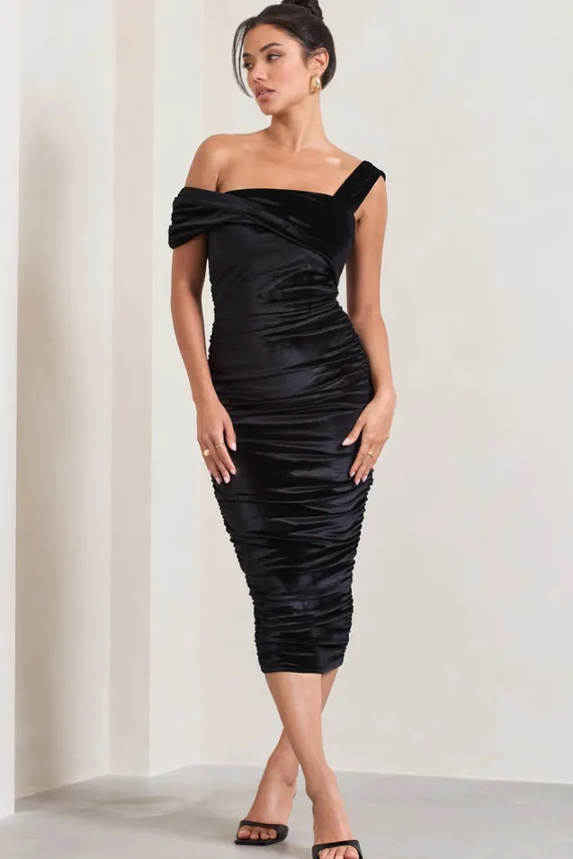 Daniela | Black Velvet One Shoulder Ruched Midi Dress