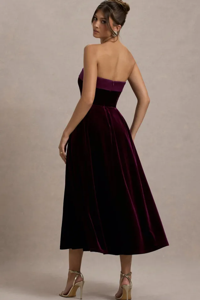 Defined by its rich texture and timeless elegance, Delray is a sophisticated choice for your next special occasion. Wrapped in our premium port velvet, this bandeau midi dress is designed to highlight your silhouette with its sleek, fitted shape. The subtle satin detailing adds a touch of refinement, elevating the overall look. Perfect for an evening soiree or a formal dinner, keep Delray in focus with minimalist accessories and classic heels to exude effortless grace and style.Features – Premium velvet and satin- Folded bandeau neckline – Invisible zip closure – Pleated skirt- Mesh underskirt- Midi length Sizing & Fit Model is 5’7 and wears UK size 8/US size 4 Product Information Designed exclusively by Club L London Double layered/good stretch Premium velvet and satin in Port (93% Polyester, 7% Elastane)Lining (97% Polyester, 3% Elastane)85cm total length